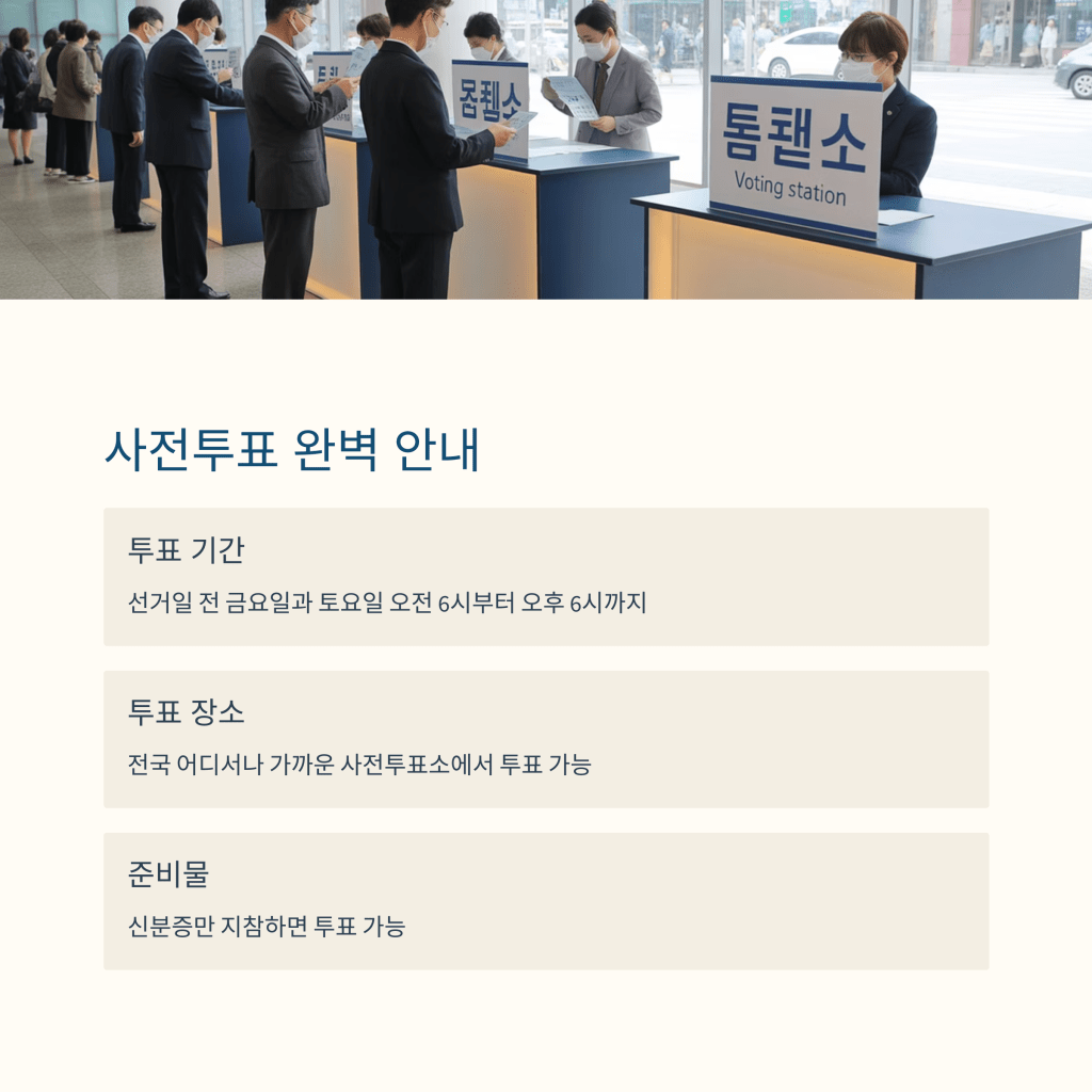 사전투표는 전국 어디서나 가능합니다. 선거관리위원회 홈페이지에서 가까운 사전투표소를 확인할 수 있으며, 다음과 같은 절차로 진행됩니다: