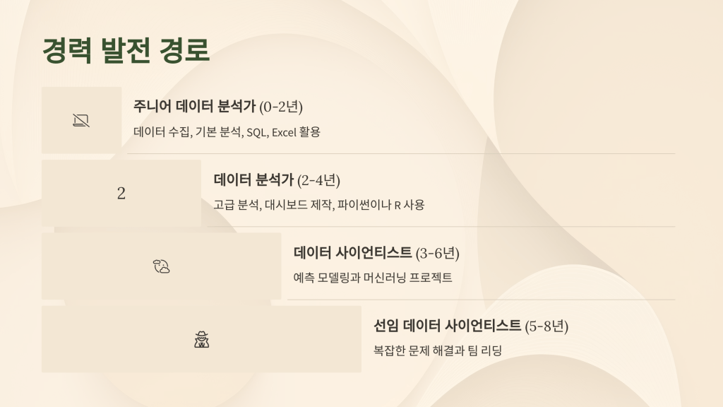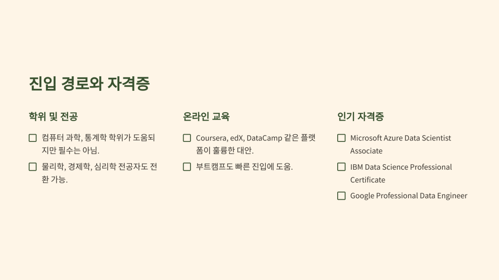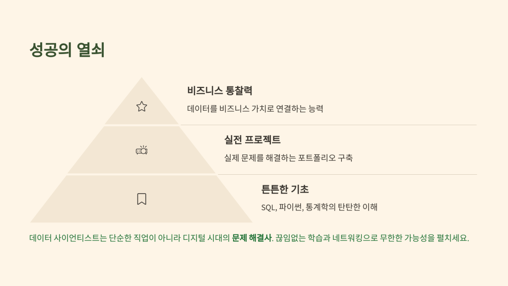 데이터가 세상을 지배하는 시대, 데이터 사이언티스트는 미래 기술 산업의 핵심 인재로 떠오르고 있습니다. 이들은 SQL, 파이썬, 머신러닝을 활용해 방대한 데이터에서 통찰력을 발굴하고, 금융부터 헬스케어까지 모든 산업의 혁신을 이끌어냅니다. 단순한 분석을 넘어 비즈니스 가치를 창출하며 높은 연봉과 무한한 가능성을 제공하는 이 직업은, 끊임없는 학습과 문제 해결 능력을 통해 여러분을 디지털 시대의 선구자로 만들어 줄 것입니다. 데이터 사이언티스트의 여정을 지금 시작하세요!