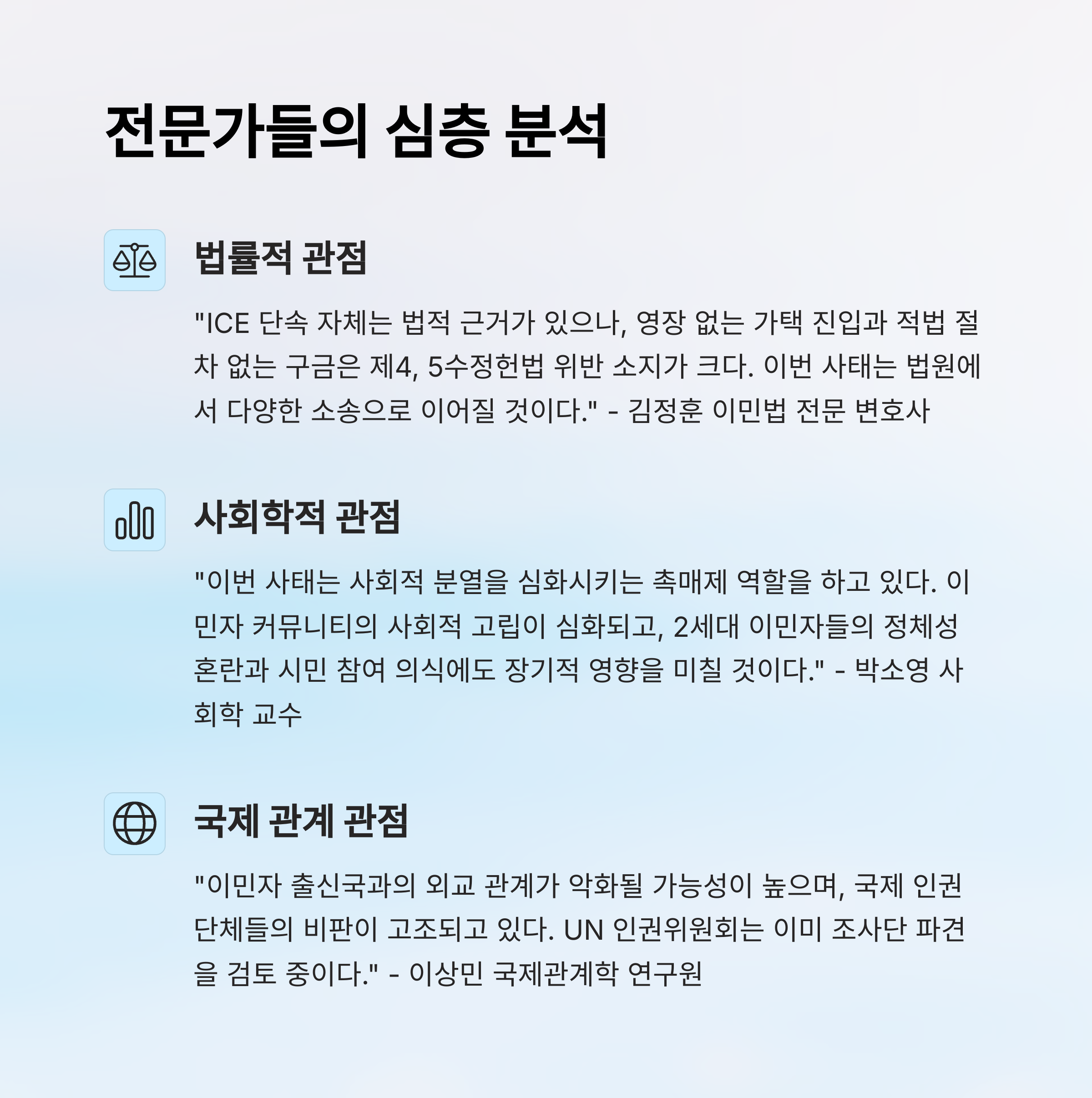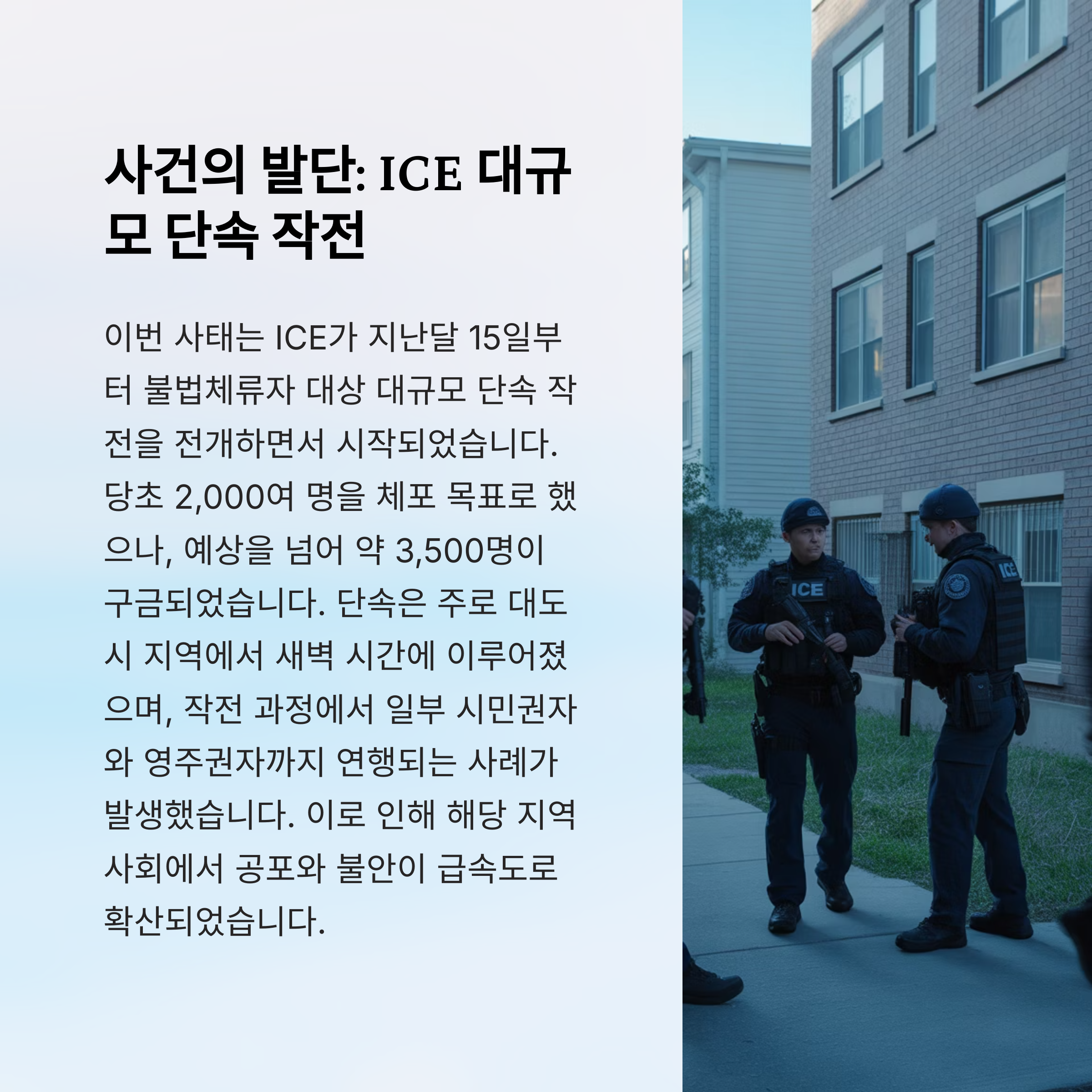A6. 이민정책연구소는 이번 사건을 “미국 이민정책의 새로운 전환점”으로 평가하며, 향후 유사한 사태가 다른 이민자 집중 거주지역에서도 발생할 가능성이 높다고 전망했습니다. 특히 텍사스, 플로리다, 뉴욕 등 주요 이민 도시들이 주목받고 있습니다.