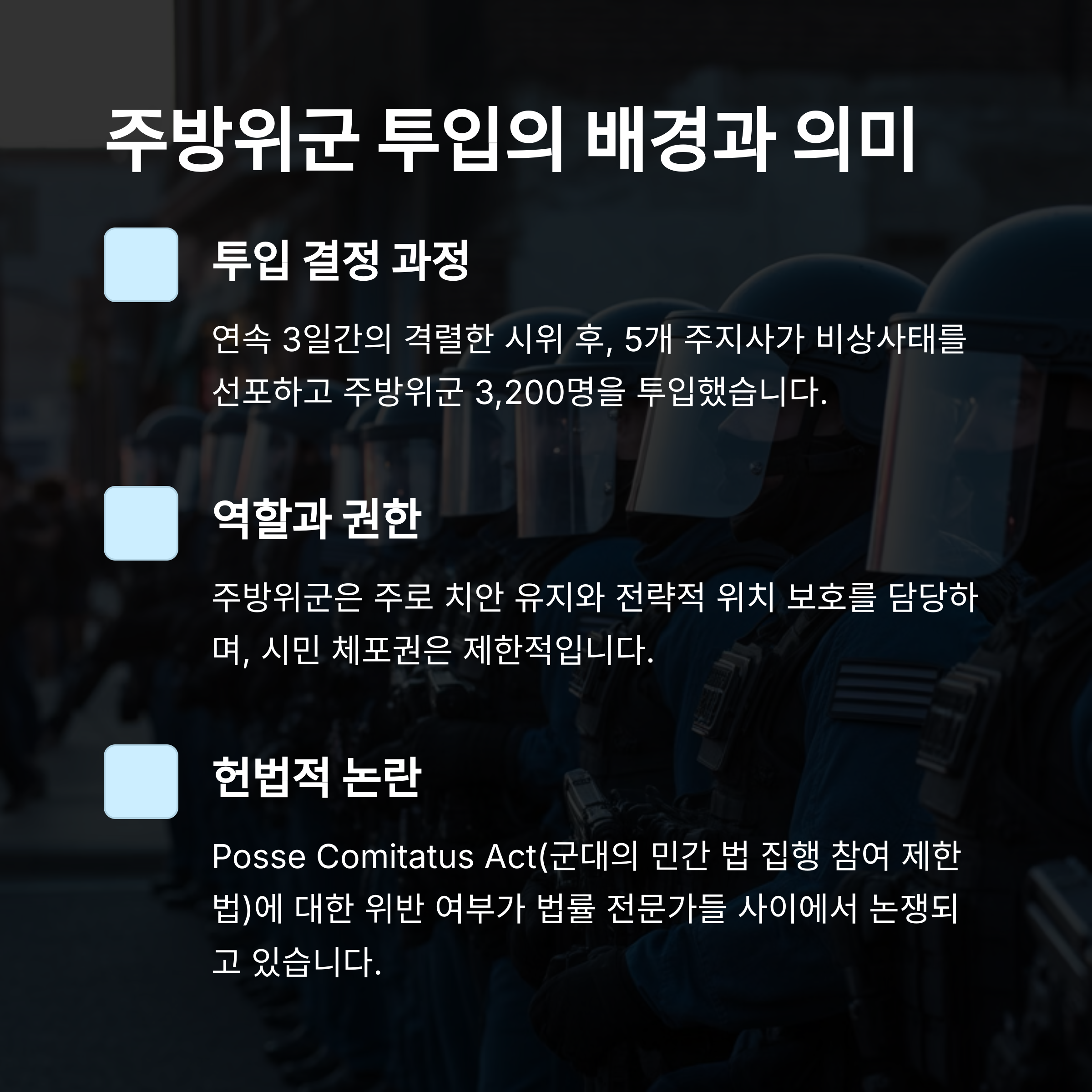 A2. 미국 연방법에 따른 “연방정부에 대한 반란 위협”을 근거로 했습니다. 시위대의 로이발 연방청사 침입 시도 등을 반란 행위로 간주하여 대통령 각서를 통해 주방위군 2,000명 투입을 명령했습니다. 이는 1992년 LA 폭동 이후 33년 만의 군사력 동원입니다.