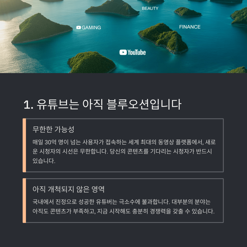 레드오션처럼 보일 수 있지만, 사실상 국내에서 성공한 유튜버는 극소수입니다. 대부분의 분야는 아직도 콘텐츠가 부족하고, 지금 시작해도 늦지 않습니다. 아니, 지금 시작해야 합니다.