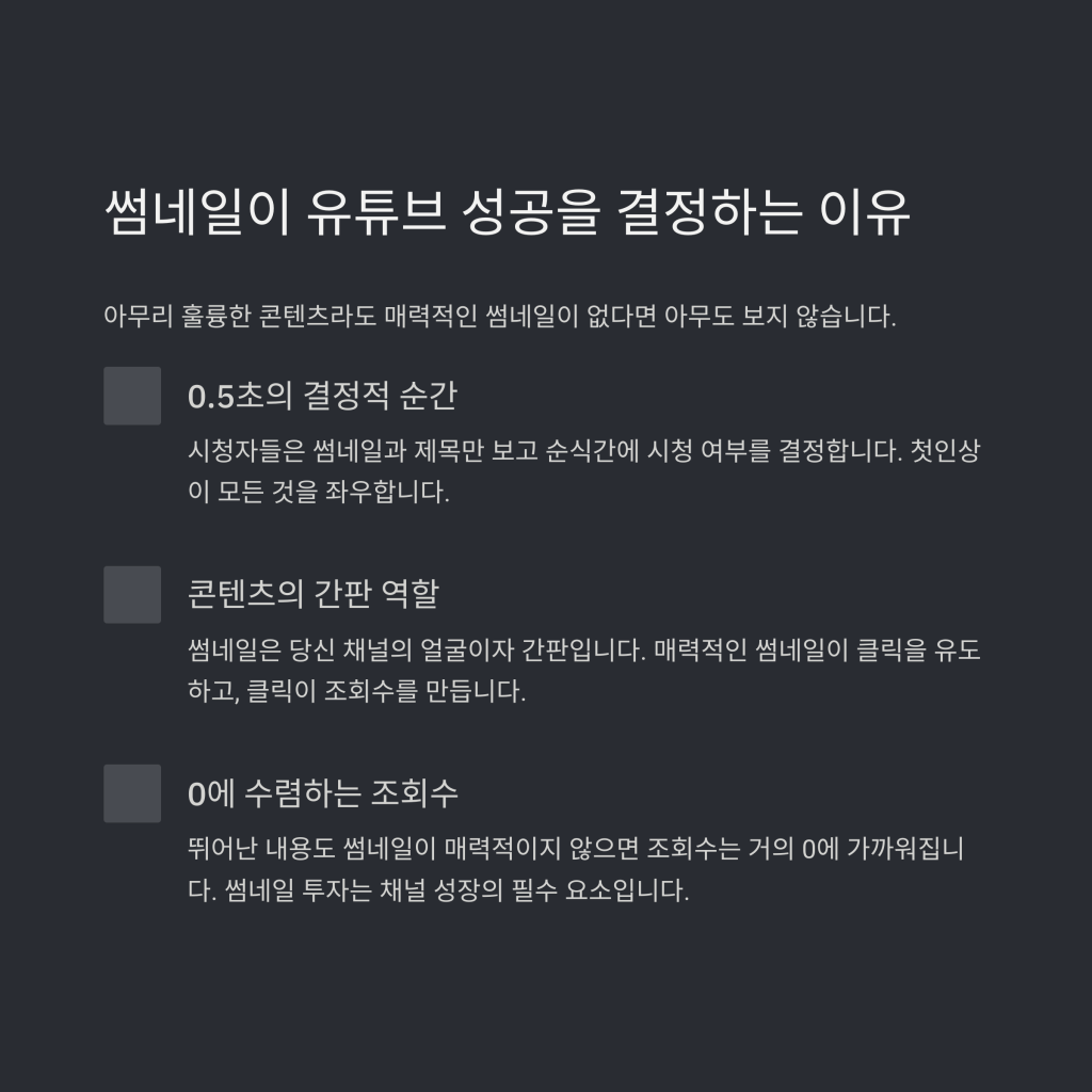 썸네일 = 당신 콘텐츠의 간판입니다. 썸네일이 클릭을 부르고, 클릭이 조회수를 만듭니다.