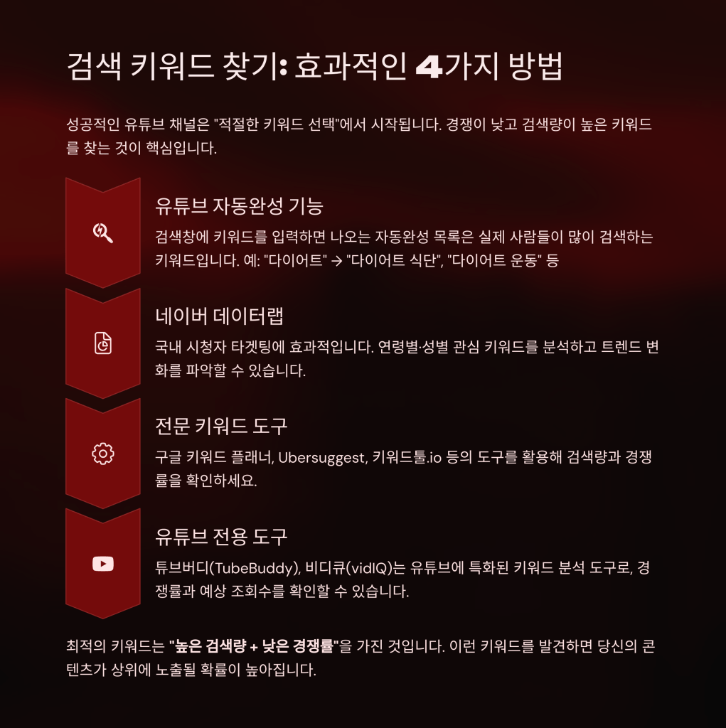 - 무료 키워드 툴: vidIQ, 튜브버디 등에서 키워드 경쟁률 확인