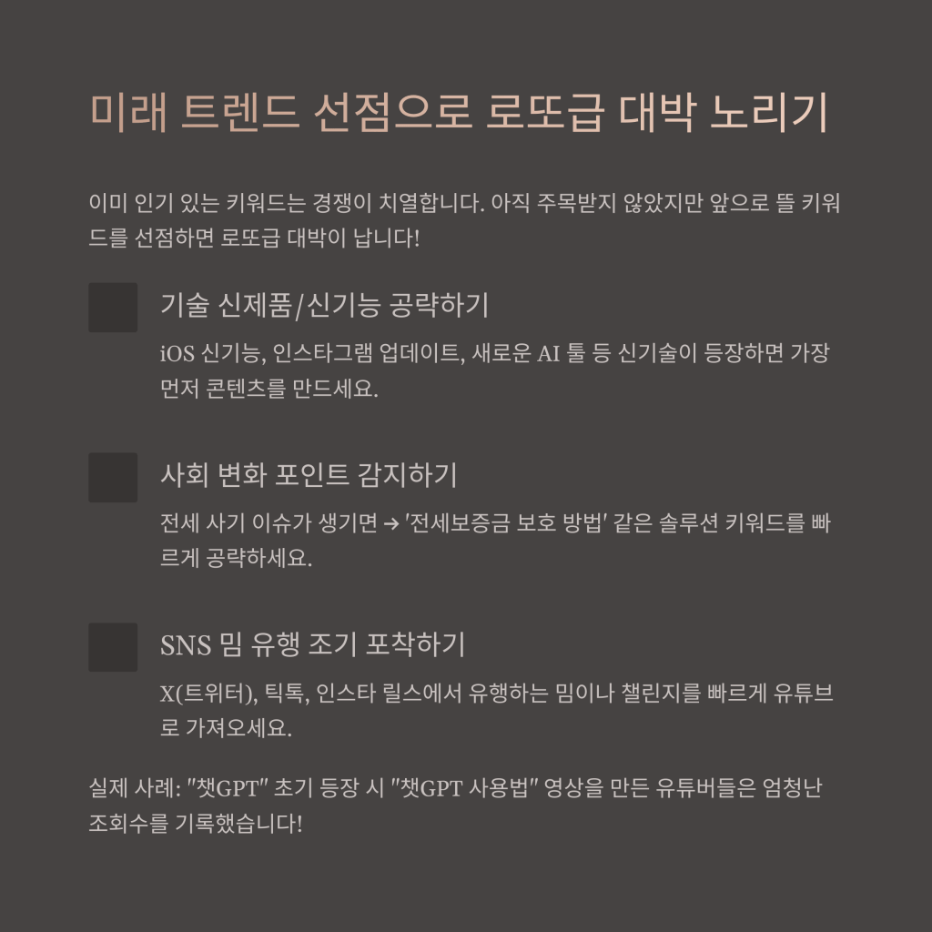 - 이슈 기반 키워드 예: “챗GPT” 초기 등장 당시 → “챗GPT 사용법” 영상 폭발