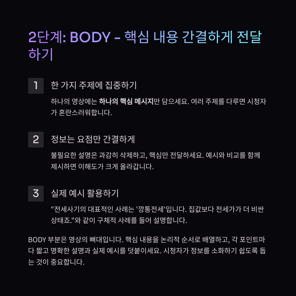 - 이 3단계 구조만 익혀도 영상 흐름이 자연스럽고 집중도를 높일 수 있어요.