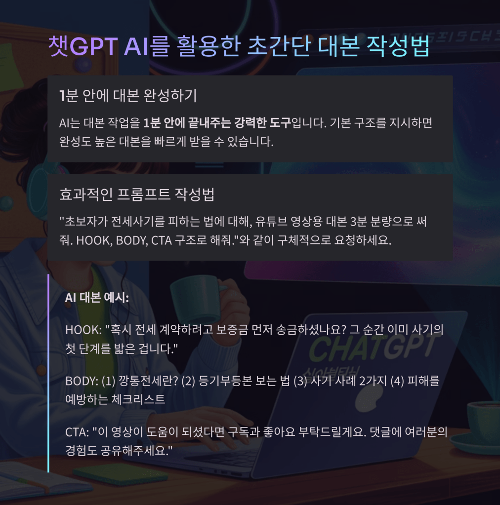- 결과: 챗GPT가 구조화된 대본을 빠르게 제공합니다.