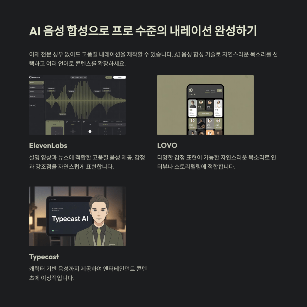 | 음성 녹음 | ElevenLabs, LOVO, Typecast | AI 내레이션, 성별/톤 선택 가능 |