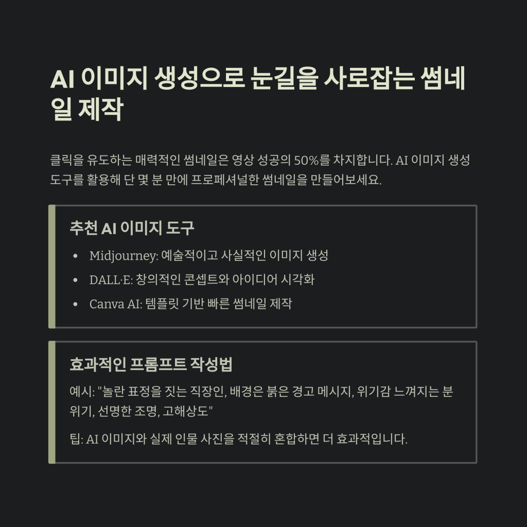 | 썸네일 디자인 | Canva AI, Midjourney, DALL·E | 이미지 생성 + 자동 디자인 조합 |