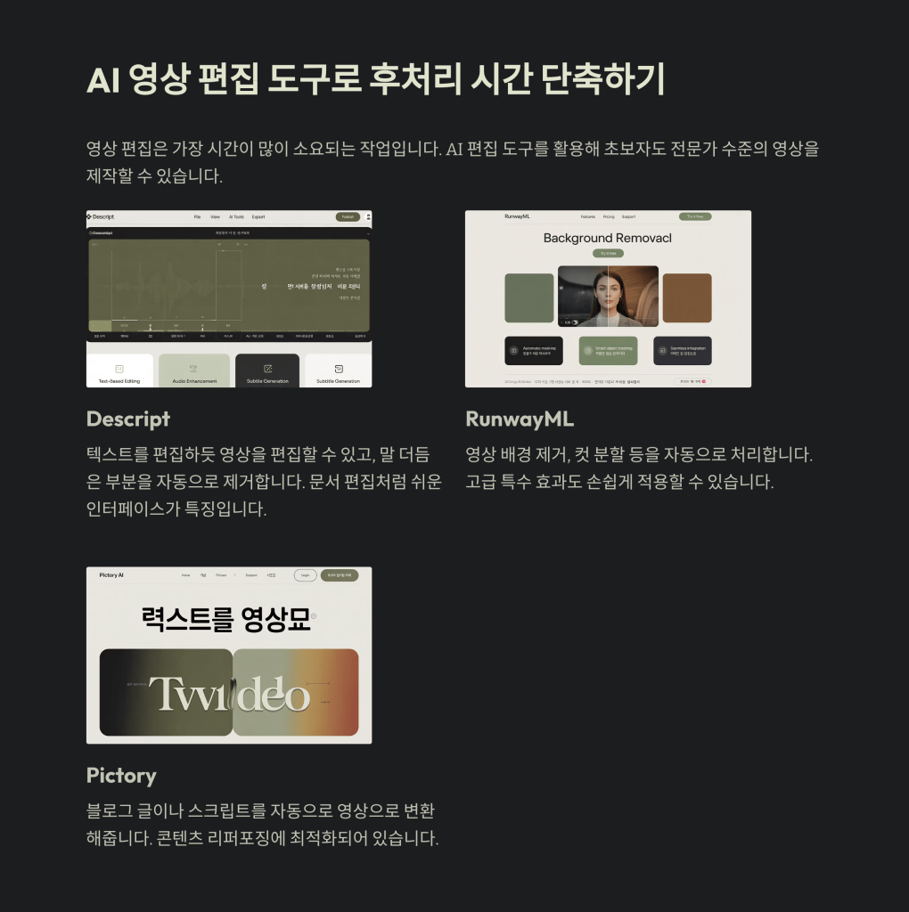 | 영상 편집 | RunwayML, Pictory, Descript | 자동 컷 편집, 텍스트 기반 영상 제작 |